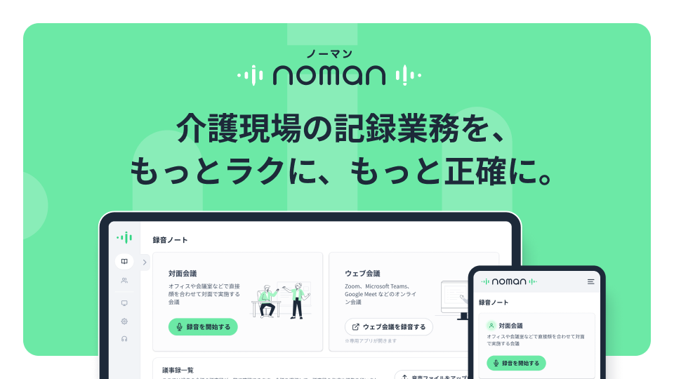 | アピールポイント | noman(ノーマン)は、介護業界特化のAI議事録作成ツールです。音声や簡単なメモを渡すだけで、AIが文字起こし・要約・整理を自動で処理。正確な議事録が短時間で完成します。居宅介護支援事業所、訪問系・通所系・入所系サービスなどの幅広い分野でご利用いただいており、導入事業所数は10,000を突破しました。 |
